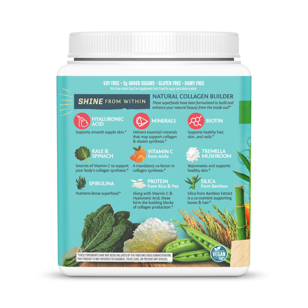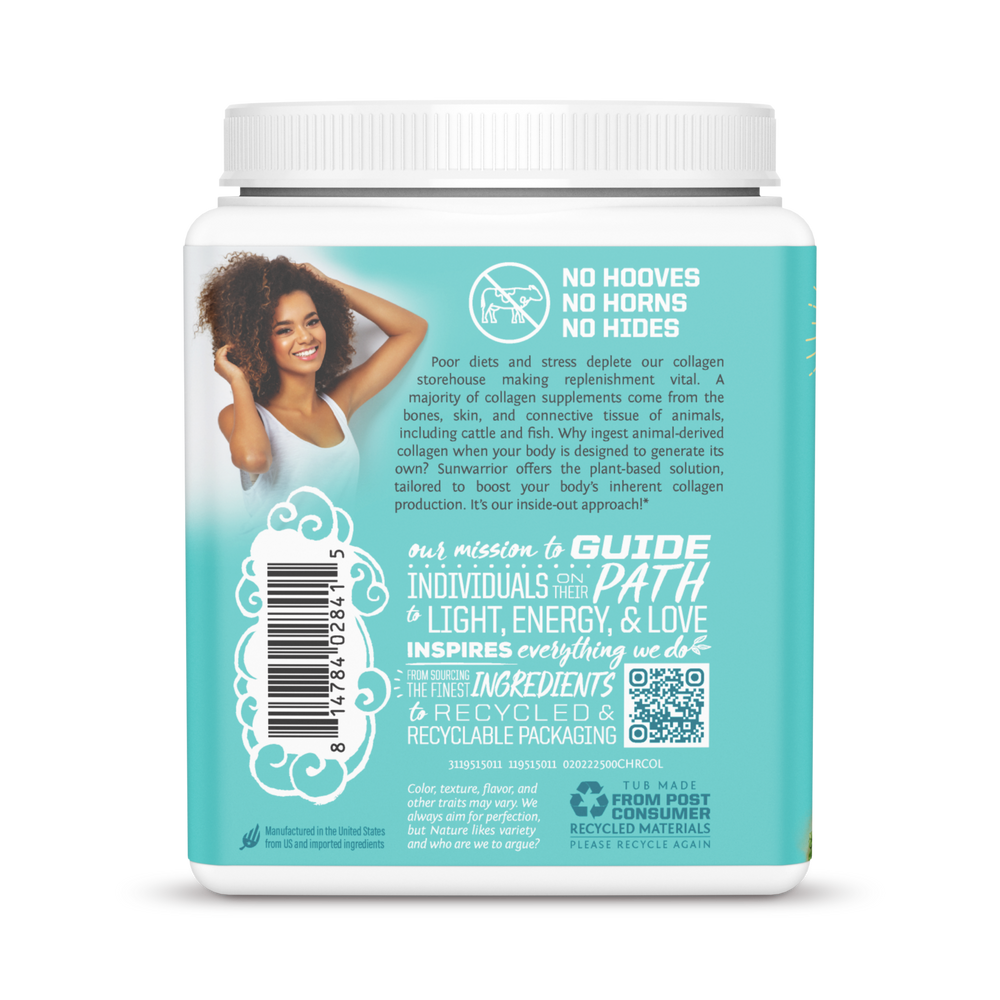 Poor diets and stress deplete our collagen storehouse making replenishment vital. A majority of collagen supplements come from the bones, skin, and connective tissue of animals, including cattle and fish. Why ingest animal-derived collagen when your body is designed to generate its own? Sunwarrior offers the plant-based solution, tailored to boost your body's inherent collagen production. It's our inside-out approach!