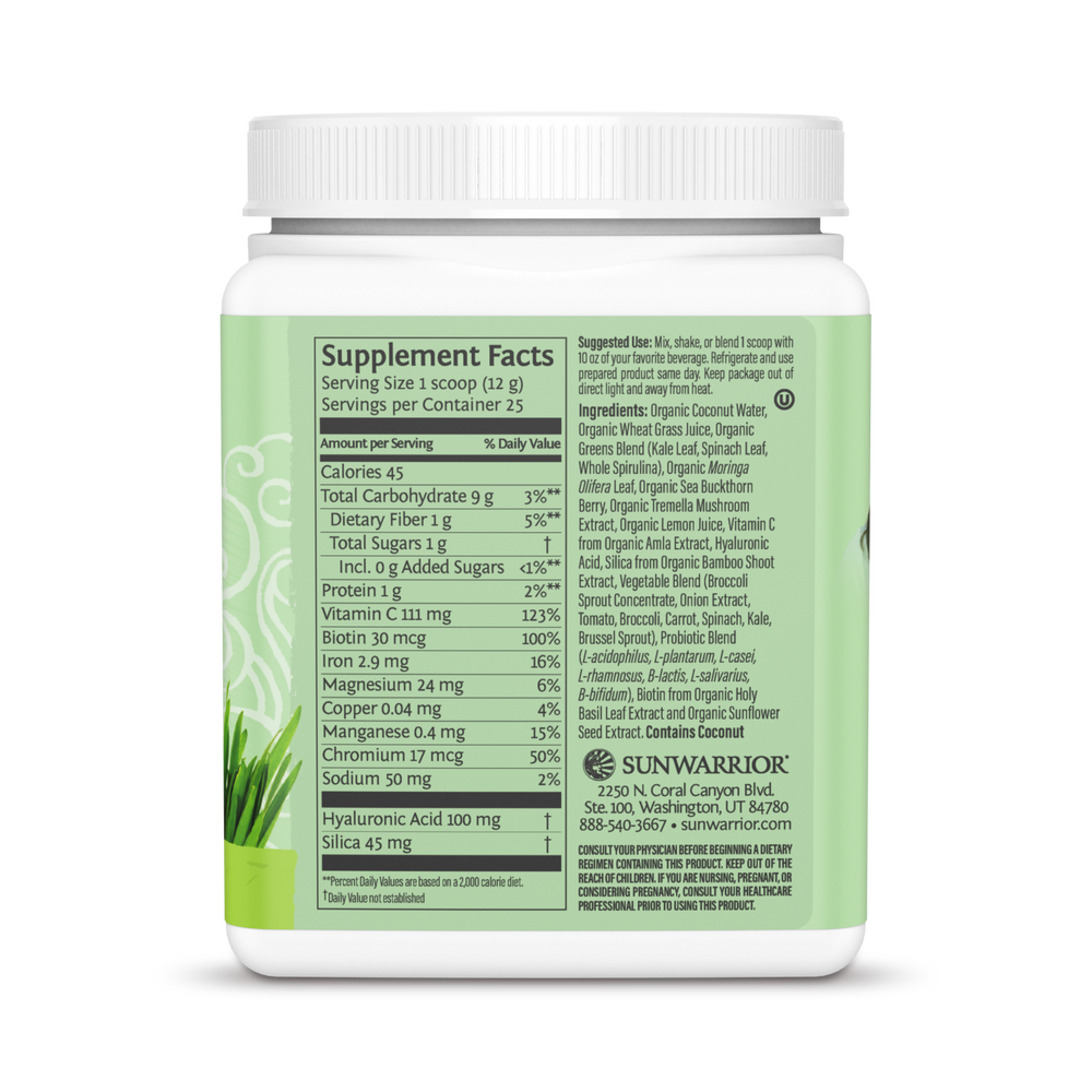 Organic coconut water, organic wheat grass juice, organic greens blend (kale leaf, spinach leaf, whole spirulina), organic moringa olifera leaf, organic sea buckthorn berry, organic tremella mushroom extract, organic lemon juice, vitamin c from organic amla extract, hyaluronic acid, silica from organic bamboo shoot extract, vegetable blend (broccoli sprout concentrate, onion extract, tomato, broccoli, carrot, spinach, kale, brussel sprout), probiotic blend (l-acidophilus, l-plantarum, l-casei, l-rhamnosus, b-lactis, l-salivarius, b-bifidum), biotin from organic holy basil leaf extract and organic sunflower seed extract.