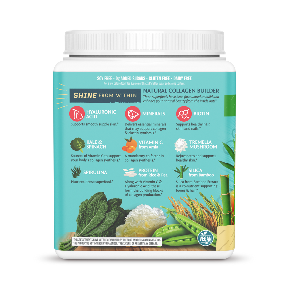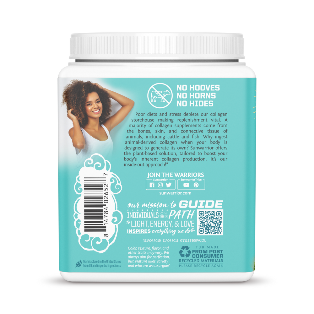 Poor diets and stress deplete our collagen storehouse making replenishment vital. A majority of collagen supplements comes from the bones, skin, and connective tissue of animals, including cattle and fish. Why ingest animal-derived collagen when your body is designed to generate its own? Sunwarrior offers the plant-based solution, tailored to boost your body's inherent collagen production. It's our inside-out approach!