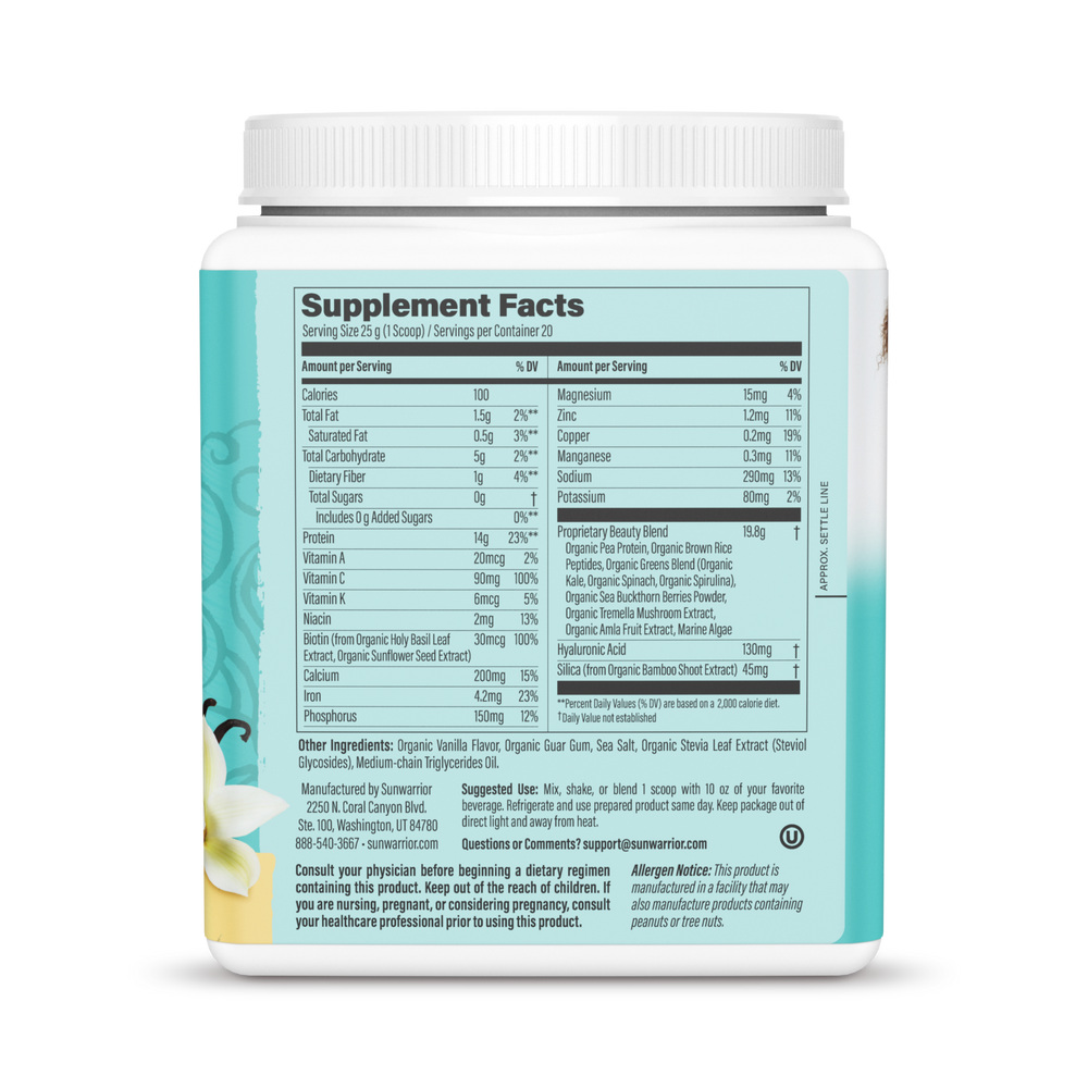 | Proprietary Beauty Blend Organic Pea Protein, Organic Brown Rice Peptides, Organic Greens Blend (Organic Kale,Organic Spinach, Organic Spirulina), Organic Sea Buckthorn Berries Powder, Organic Tremella Mushroom Extract, Organic Amla Fruit Extract, Marine Algae. |