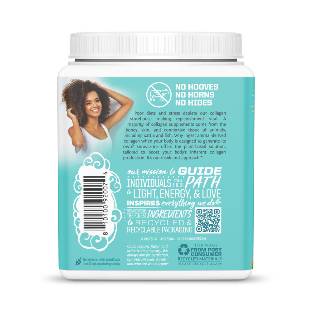 Poor diets and stress deplete our collagen storehouse making replenishment vital. A majority of collagen supplements come from the bones, skin, and connective tissue of animals, including cattle and fish. Why ingest animal-derived collagen when your body is designed to generate its own? Sunwarrior offers the plant-based solution, tailored to boost your body's inherent collagen production. It's our inside-out approach!