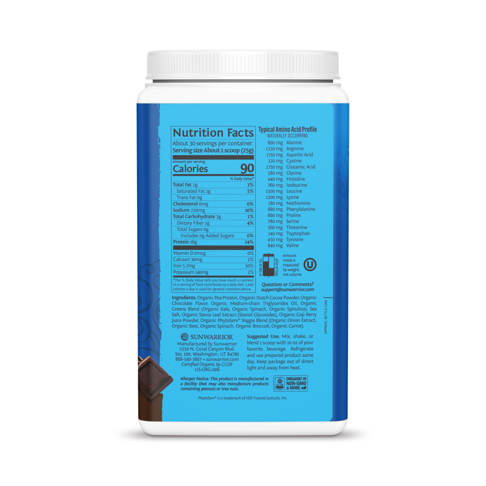 Proprietary protein blend (organic fermented brown rice, organic fermented pea, organic quinoa, organic chia seed, organic amaranth), organic cocoa, organic chocolate flavor, sea salt, organic guar gum, organic stevia extract (steviol glycosides).