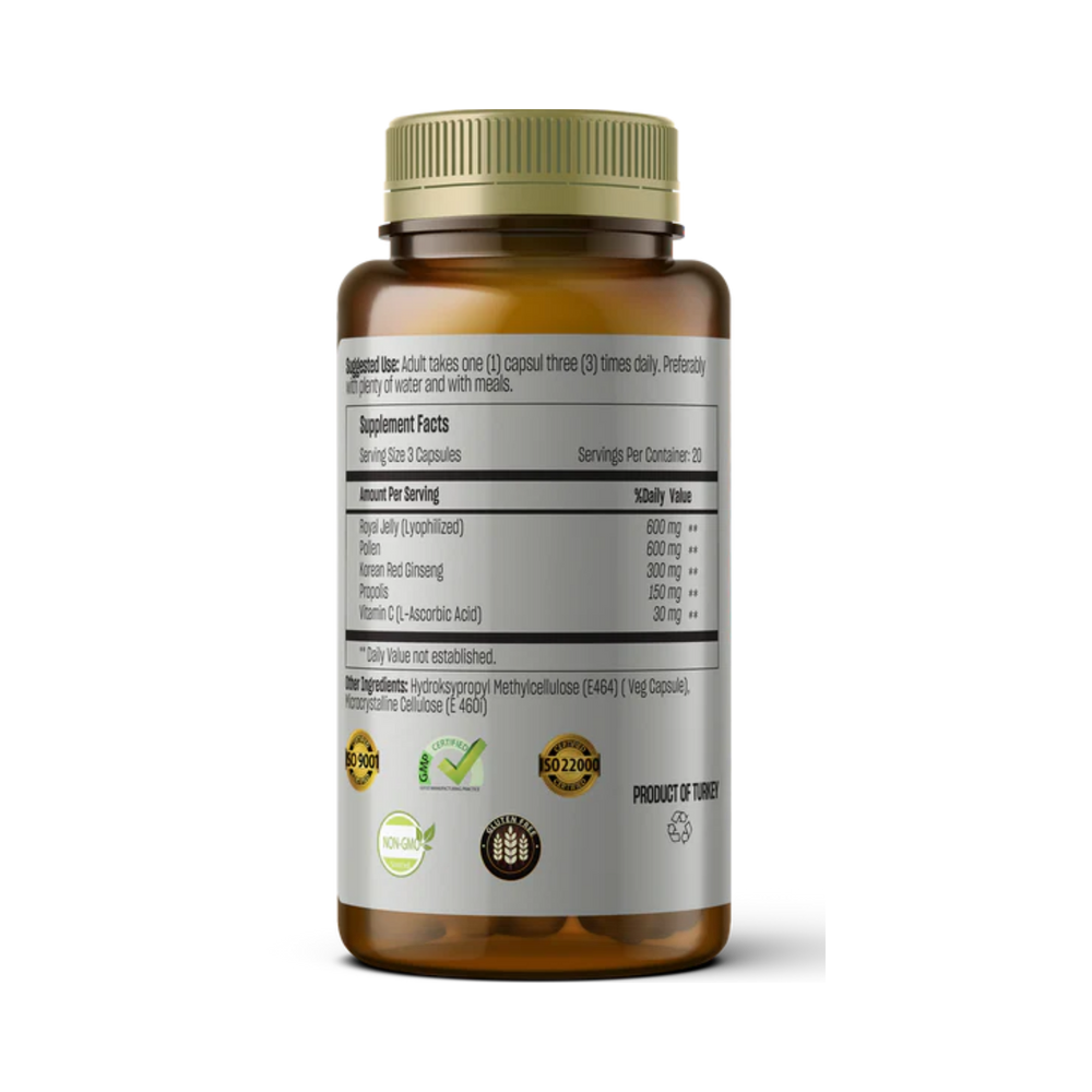 Vitamin 5 is a special formulated energy booster which supports relief of short periods of daily fatigue symptoms include temporary periods of exhaustion, tiredness and feeling of weakness or lack of vitality. With its rich ingredients such as royal jelly, pollen, korean Red ginseng, vitamin C.