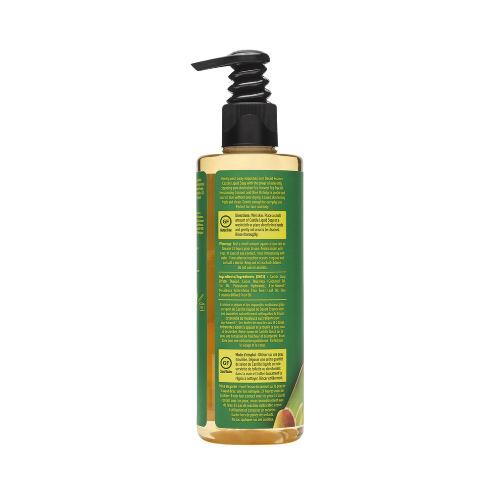 Castile Soap (Water (Aqua), Cocos Nucifera (Coconut) Oil, Tall Oil, Potassium Hydroxide), Eco-Harvest® Melaleuca Alternifolia (Tea Tree) Leaf Oil, Olea Europaea (Olive) Fruit Oil