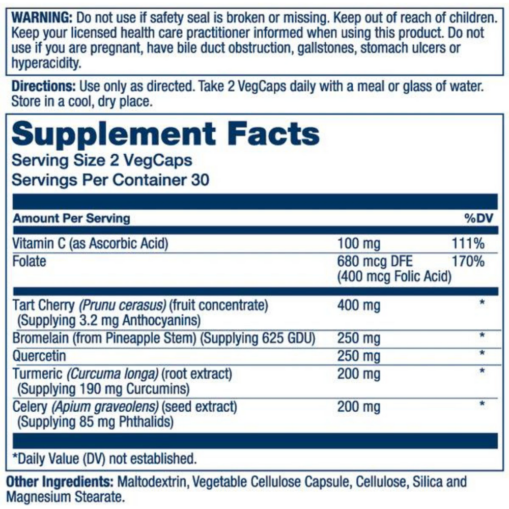1. Consists of synergistic ingredients including tart cherry, bromelain, quercetin, turmeric and celery
