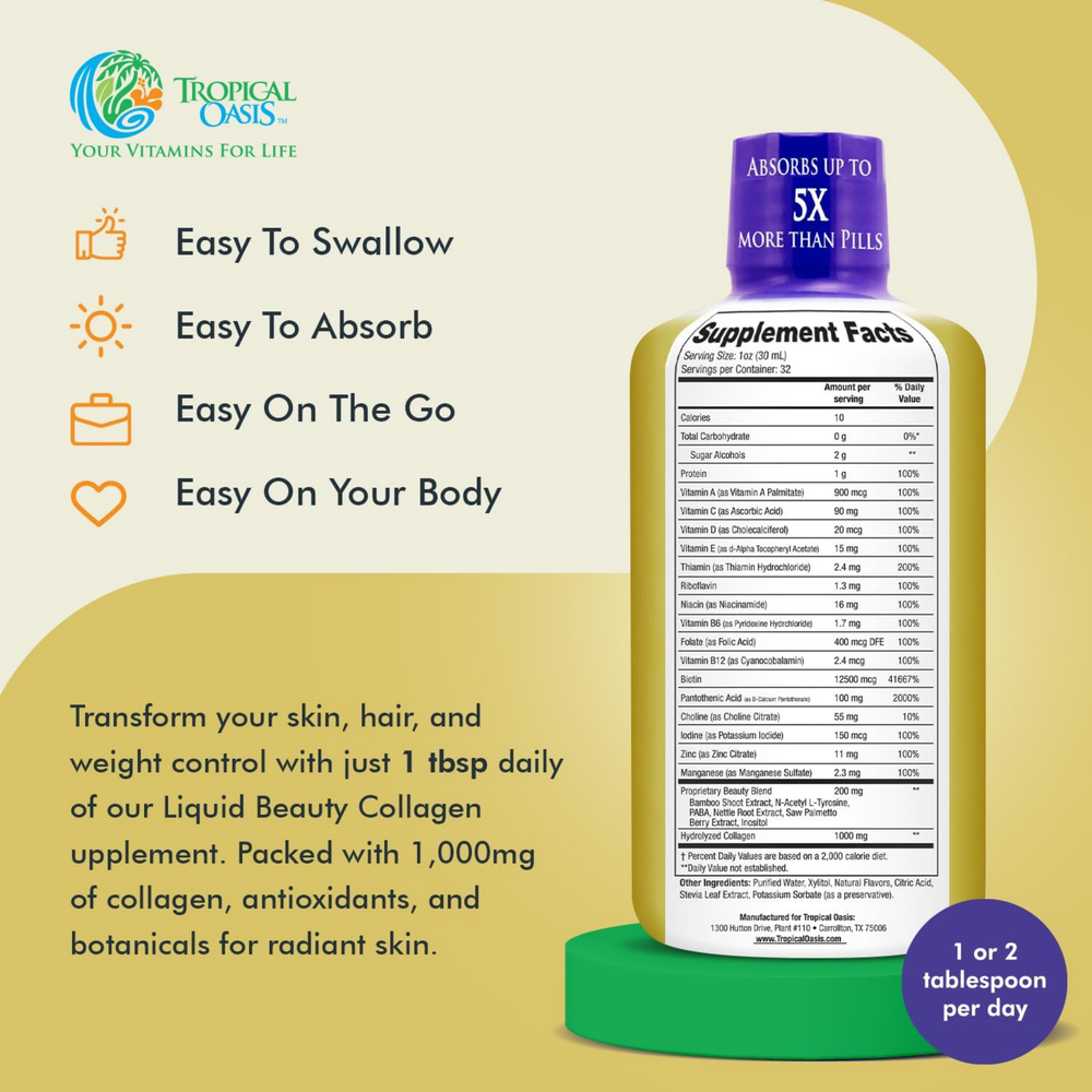 Visibly transform your skin & hair, and support your weight control goals with just 1 tablespoon a day of our advanced Liquid Beauty Collagen supplement. Our formula is designed to supply a full 1,000 mg of collagen along with an antioxidant blend, a broad spectrum of botanicals with antioxidant activity, to fight back against the loss of collagen for your most luminous skin.