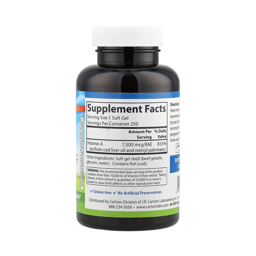 | Vitamin A (as/from cod liver oil and retinyl palmitate) | 7,500 mcg RAE | 833% |