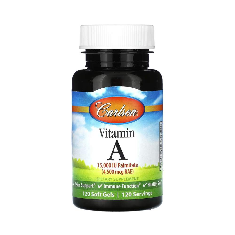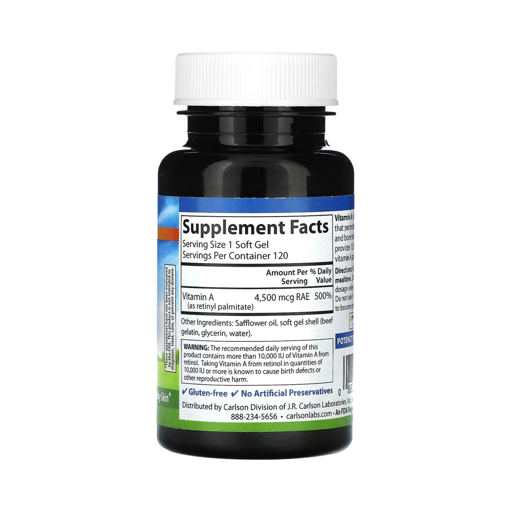 Vitamin A is an essential nutrient that promotes skin, vision, immune, and bone health. A single soft gel provides 15,000 IU (4,500 mcg RAE) of vitamin A palmitate from retinol.