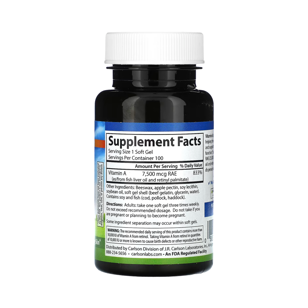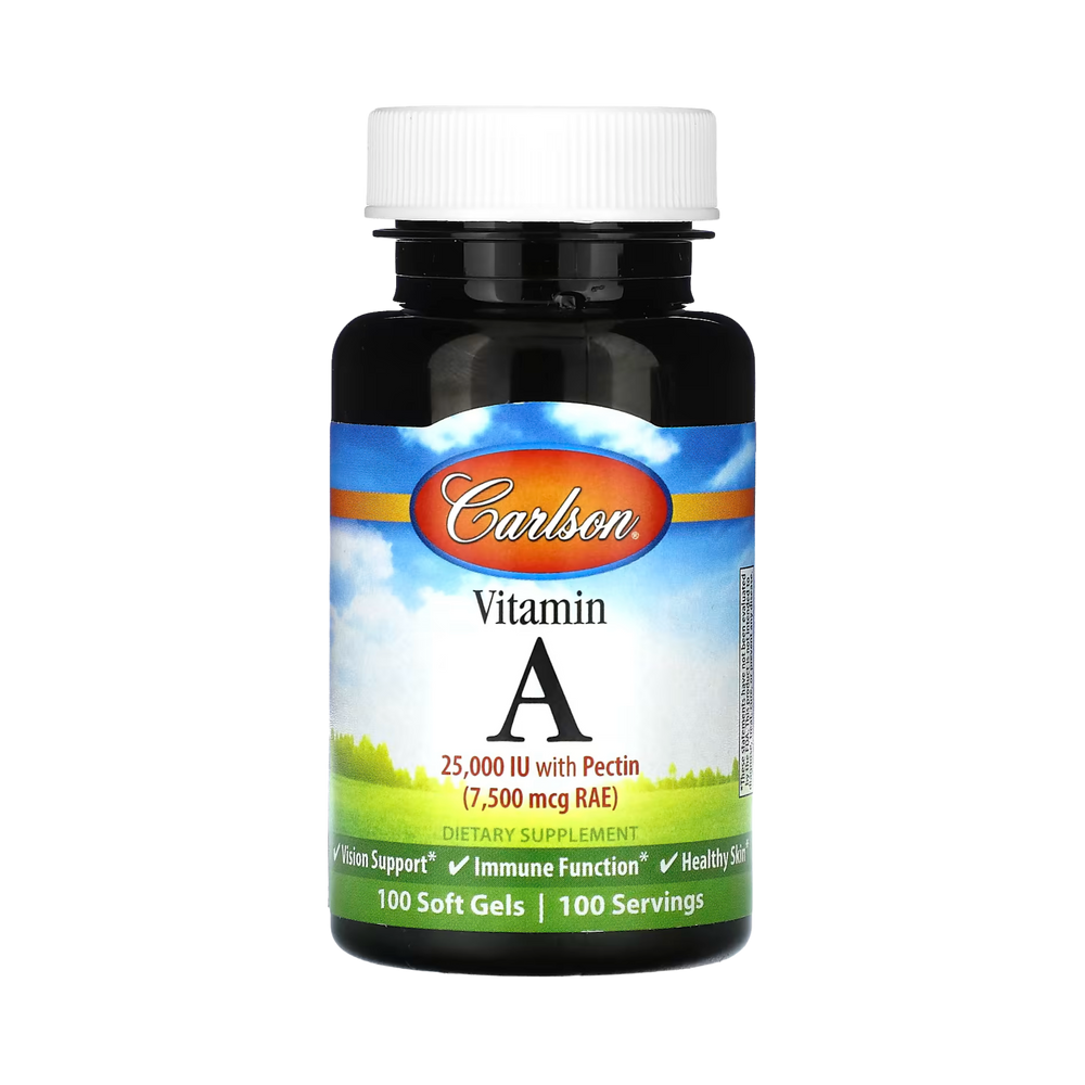 Vitamin A plays an important role in helping the eyes adapt to light changes, and supports healthy skin and immune function. Each soft gel contains 7,500 mcg RAE (25,000 IU) of vitamin A from fish liver oil and retinyl palmitate. The vitamin A is dispersed with apple pectin.