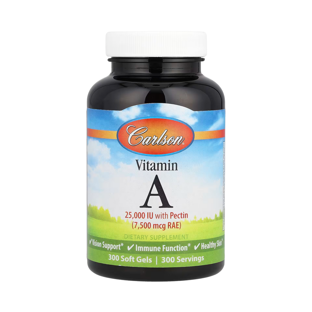 Vitamin A plays an important role in helping the eyes adapt to light changes, and supports healthy skin and immune function. Each soft gel contains 7,500 mcg RAE (25,000 IU) of vitamin A from fish liver oil and retinyl palmitate. The vitamin A is dispersed with apple pectin.