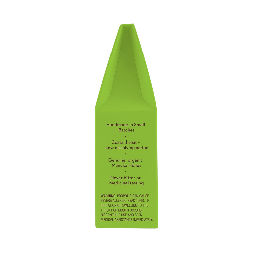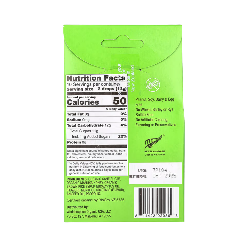 Organic cane sugar, organic manuka honey, organic brown rice syrup, eucalyptus oil (flavor), menthol crystals (flavor), aniseed oil, propolis.