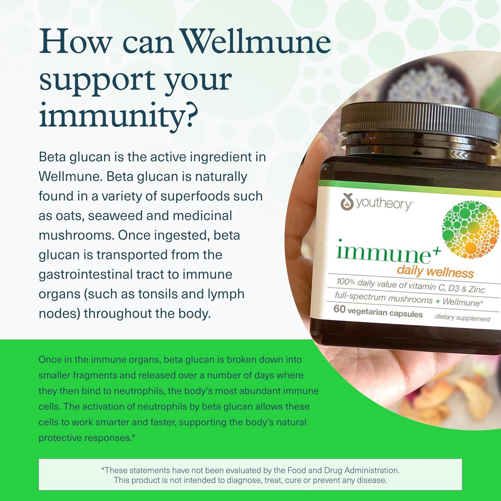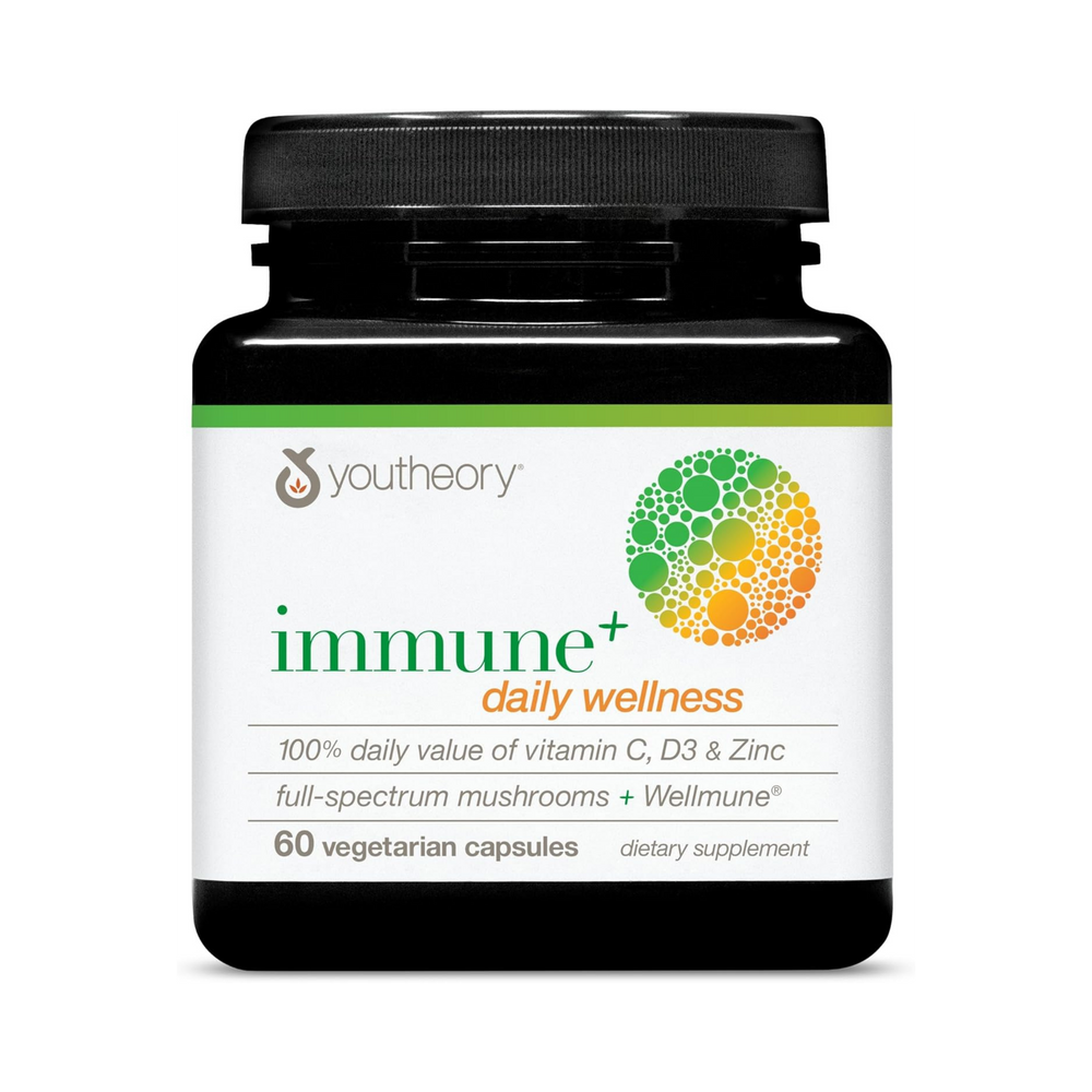 Youtheory Immune+ Daily Wellness - Organic Mushrooms - Beta Glucan - Vitamin C, D3 & Zinc, 60 Vegetarian Caps