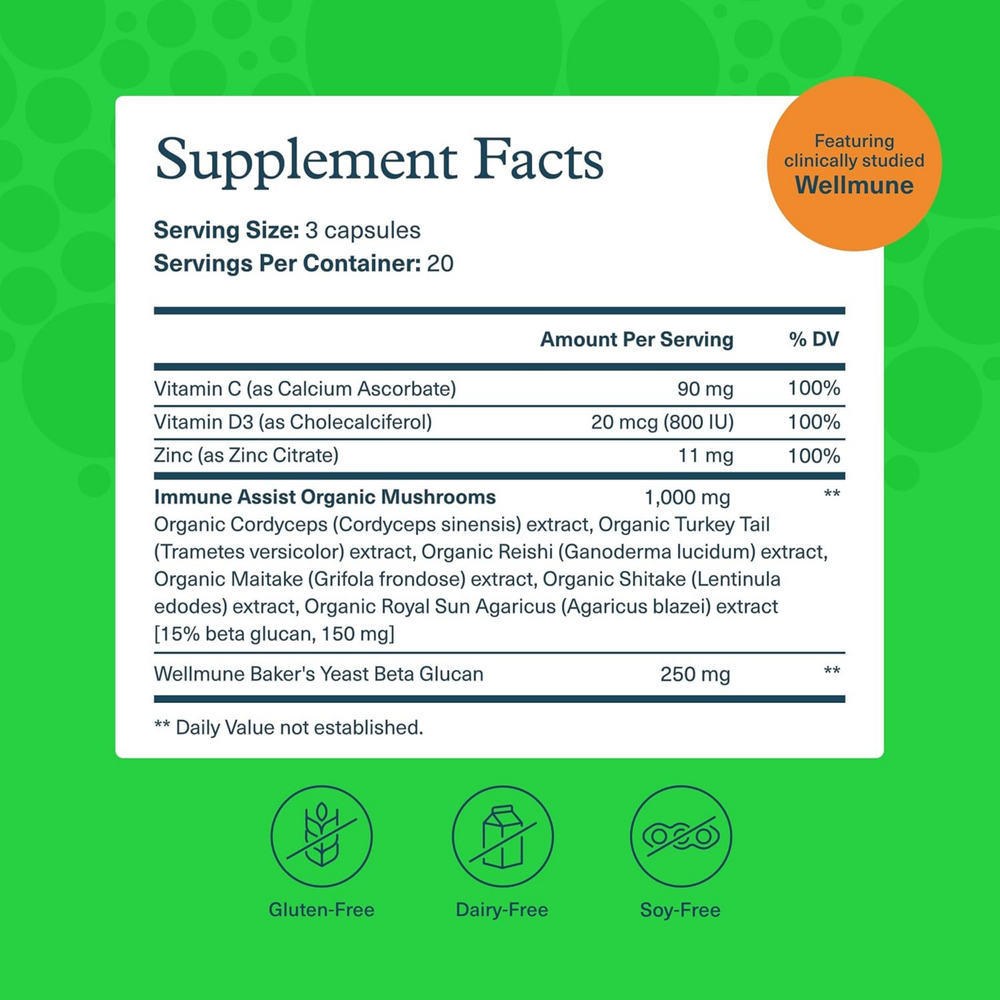 Vitamin C (as Calcium Ascorbate) 90 mg, Vitamin D3 (as Cholecalciferol) 20 mcg (800 IU), Zinc (as Zinc Citrate) 11mg, Immune Assist Organic Mushrooms 1,000 mg, Organic, Cordyceps (Cordyceps sinensis) extract ,Organic Turkey Tail (Trametes versicolor) extract, Organic Reishi (Ganoderma lucidum) extract, Organic Maitake (Grifola frondose) extract, Organic Shiitake (Lentinula edodes) extract,. Organic Royal Sun Agaricu (Agaricus blazei) extract Wellmune Baker's Yeast Beta Glucan 250 mg, Other Ingredients: Vegetable cellulose (capsule), microcrystalline cellulose, gum fiber blend, vegetable magnesium stearate, silicon dioxide. This product is manufactured in a facility that processes fish extracts.