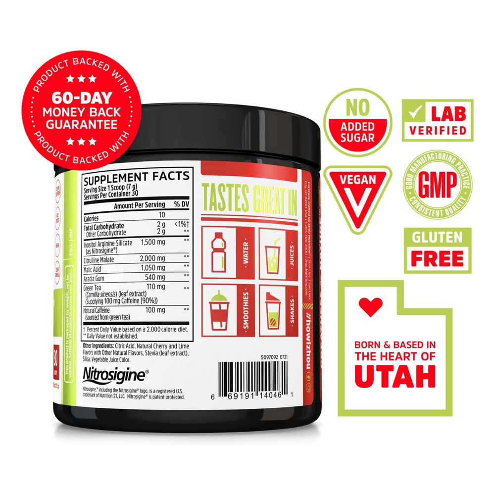 Inositol Arginine Silicate (as Nitrosigine®), Citrulline Malate, Malic Acid, Acacia Gum, Natural Caffeine (sourced from Green Tea), Citric Acid, Natural Cherry and Lime Flavors with Other Natural Flavors, Stevia (leaf extract), Silica, Vegetable Juice Color.